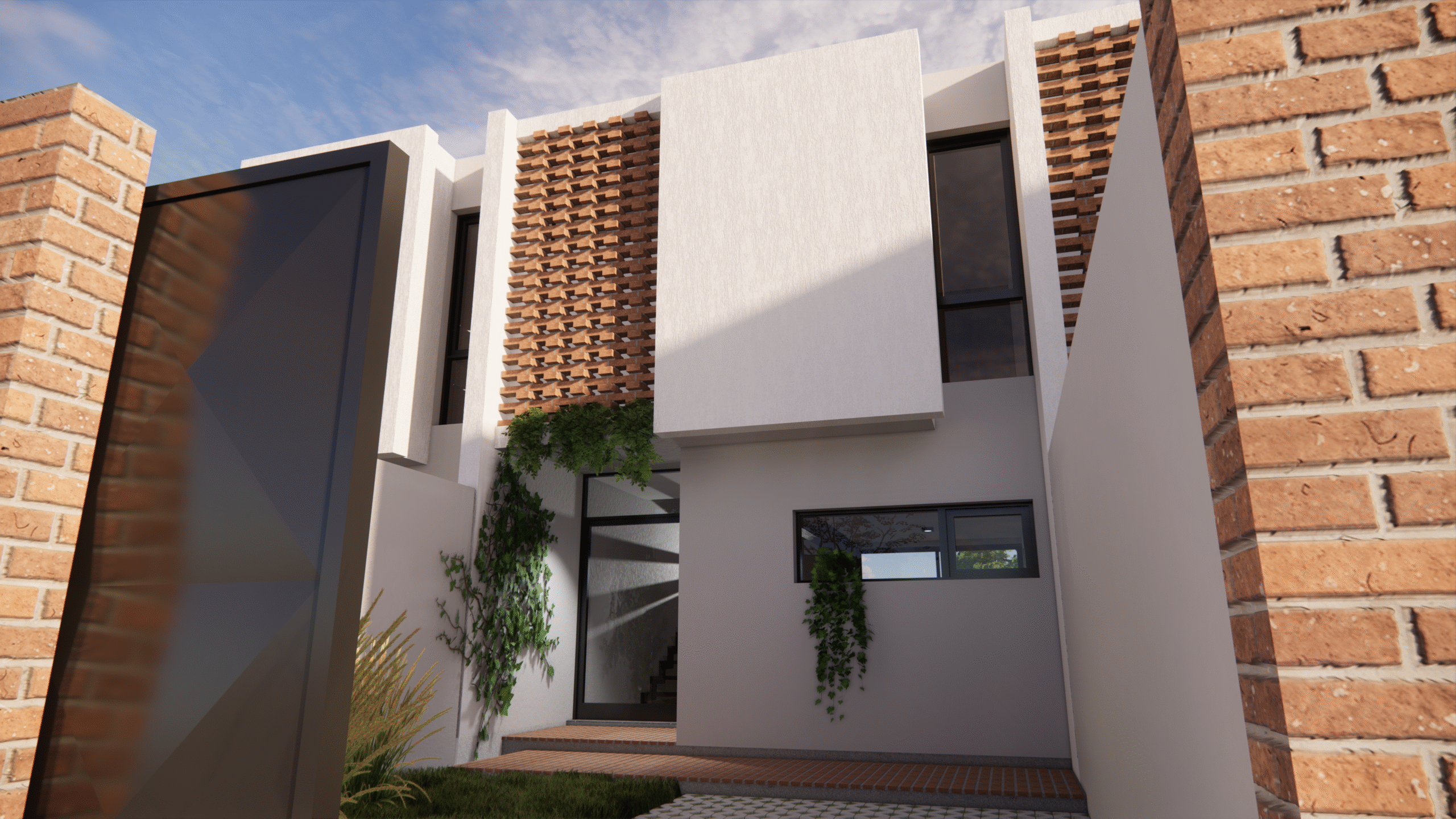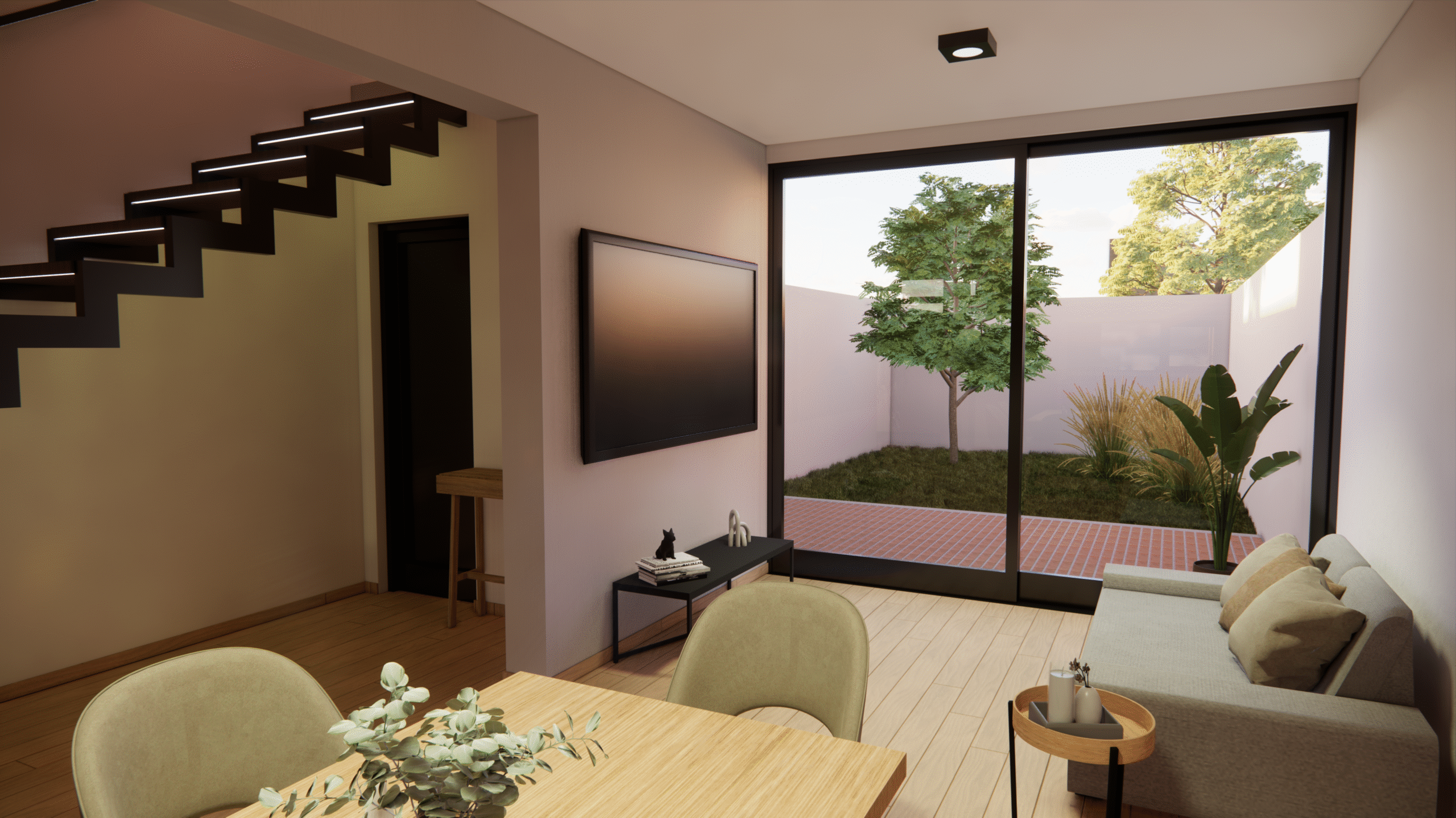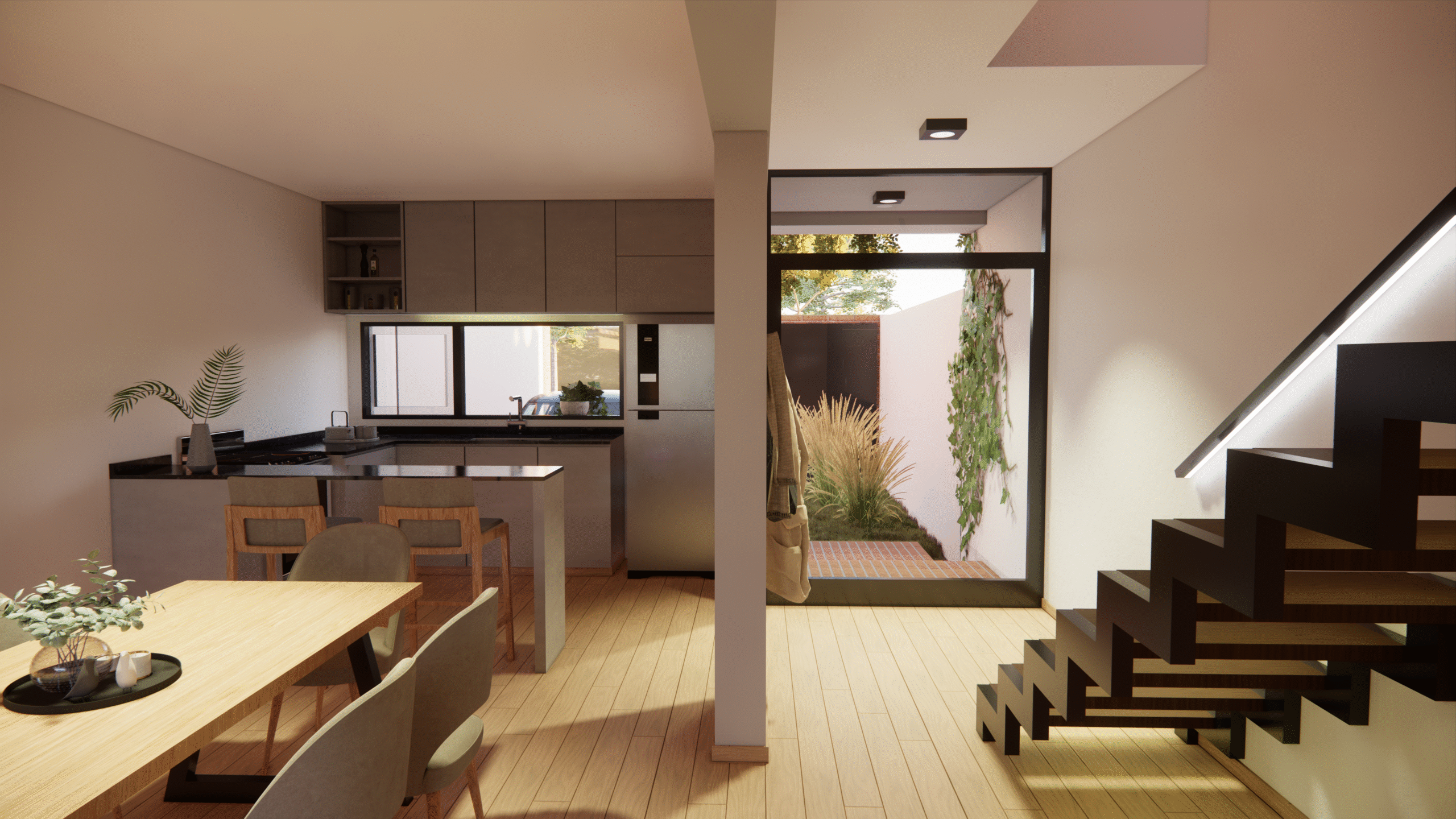 detalles en hierro negro, madera, ladrillos vistos y porcelanato